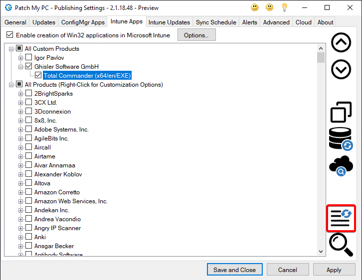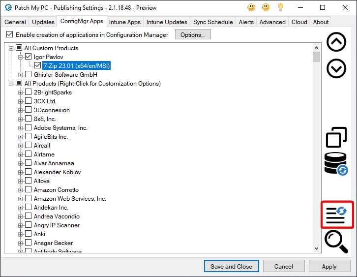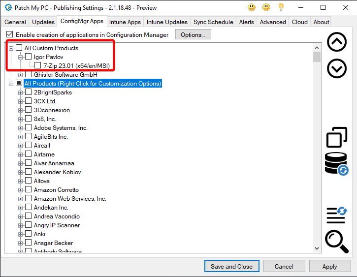 4. Enable the Custom App by checking the box next to the app, like any other product in the Patch My PC Catalog<br>
