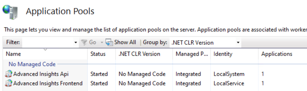 By default, the **IIS App Pools** run under the local computer account of your Advanced Insights Server.&#x20;