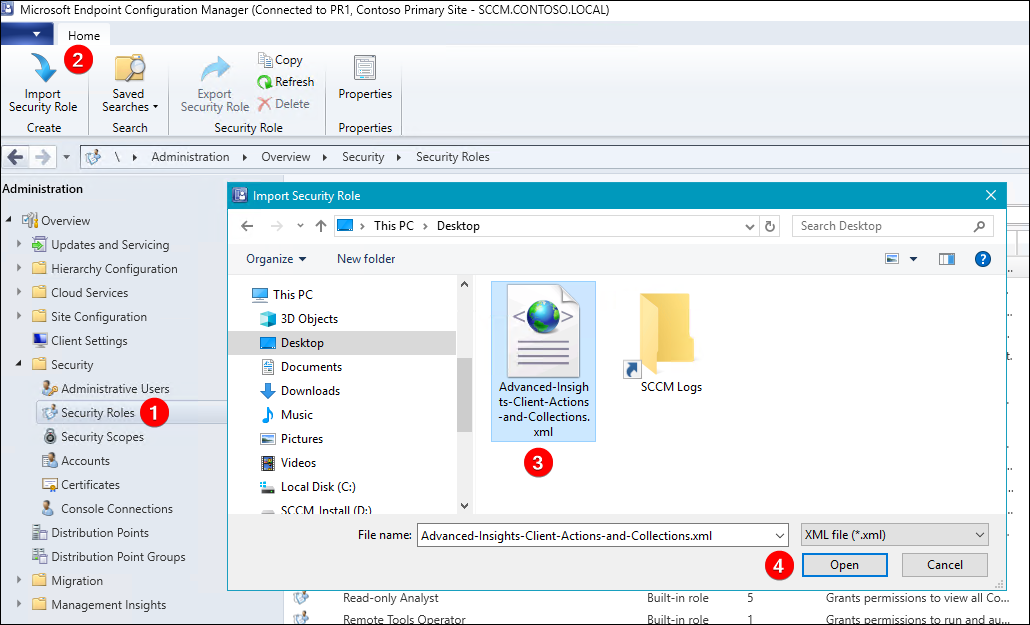To import the security role XML file, open the ConfigMgr console and navigate to **Administration** > **Security** > **Security Roles** > click **Import Security Role**.